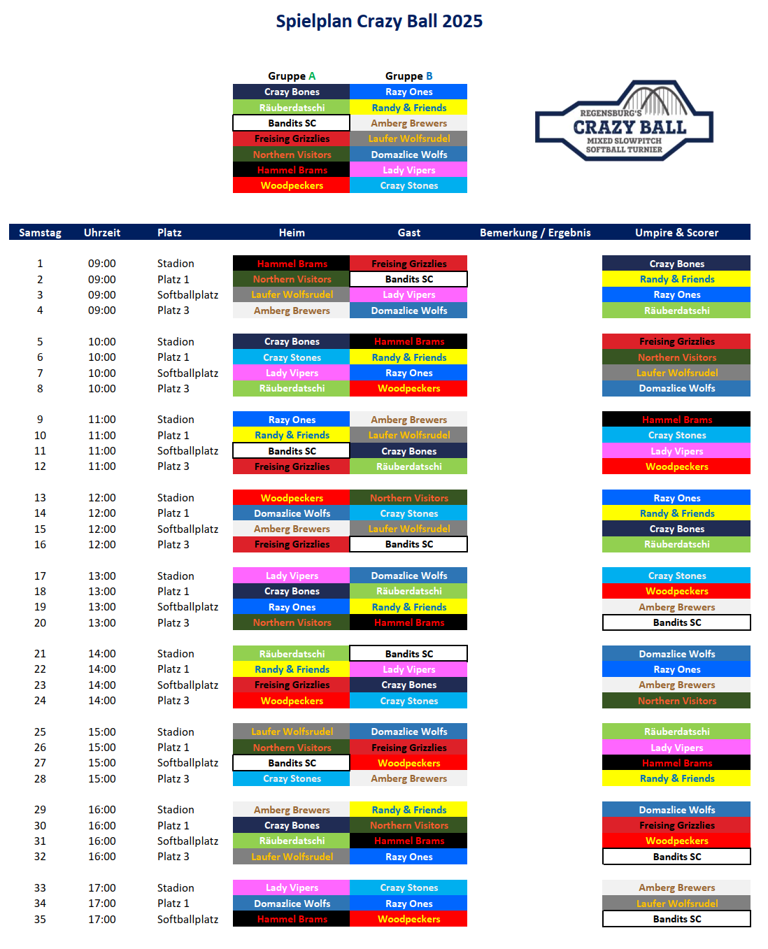 Spielplan 2025 Dieses Jahr nehmen wieder 14 Mannschaften am Turnier teil. Es wird in zwei Gruppen mit jeweils 7 Teams gespielt. Jedes Team hat am Samstag in der Vorrunde 5 Spiele. Download Crazy-Ball-Spielplan-2025.pdf